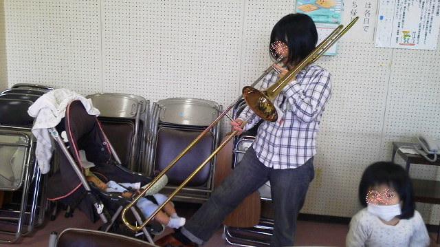 楽器を吹きつつベビーカーを足で揺らして子供をあやす たくましい2児の母(笑)